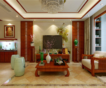 沙發(fā)背景墻:同樣是原木色的板式造型,富有變化的將壁紙合二為一,同時(shí)沙發(fā)背景墻與電視背景墻前后呼應(yīng),藍(lán)底白色荷花,一股淡雅之美。